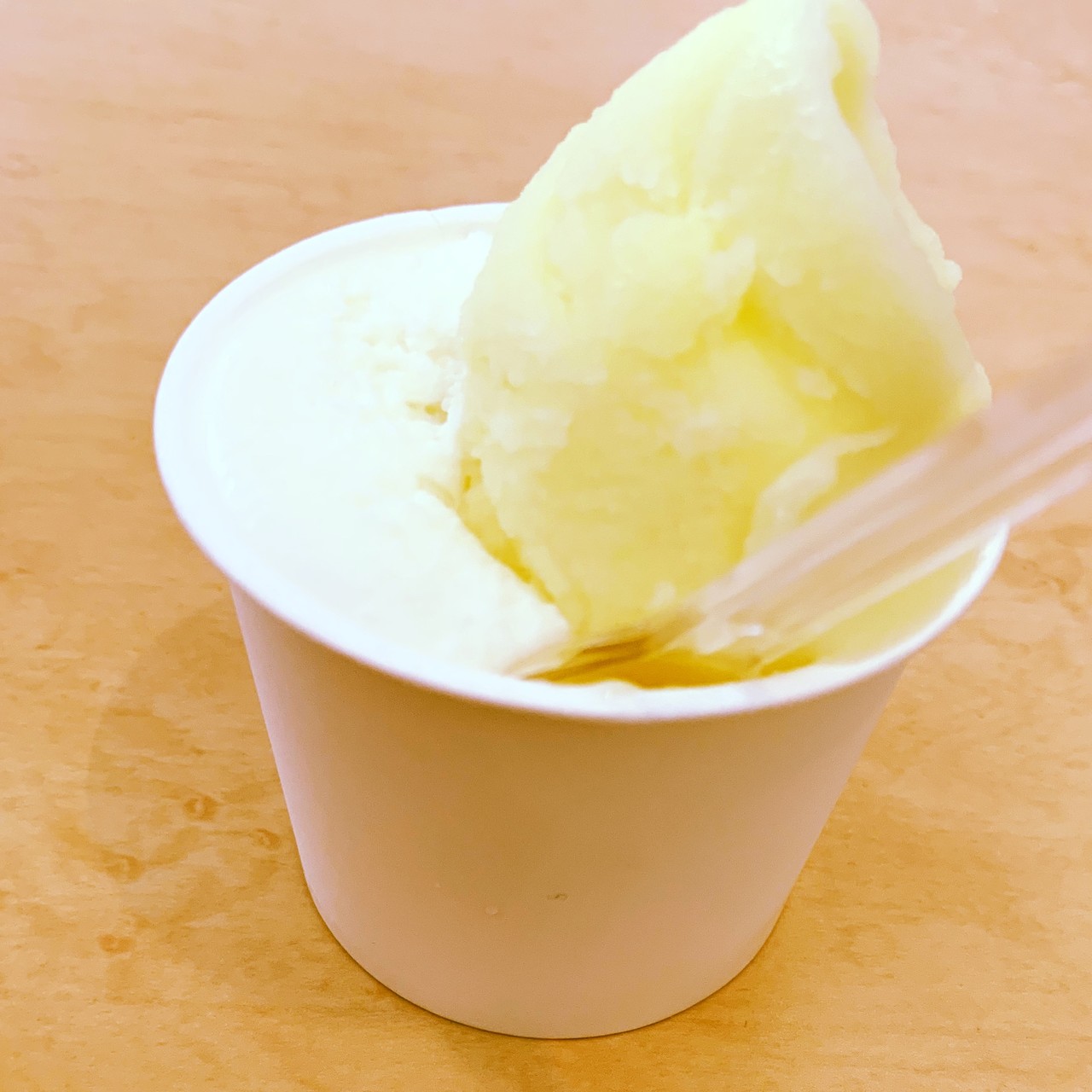 石垣島空港のミルミル本舗でジェラート。ミルクとシークヮーサーのハーフ&ハーフ。